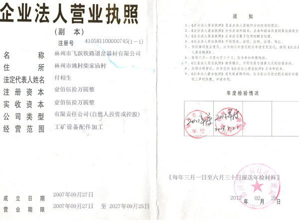 林州市飛躍鐵路道岔器材有限公司位于舉世聞名的世界八大奇跡之一“人工天河”紅旗渠畔,晉、冀、豫三省交界處,交通、通訊便捷。 公司擁有職工和管理人員120多人,高工5名,技術(shù)人員23人。擁有先進(jìn)的鑄造機(jī)加工設(shè)備和完整的質(zhì)量檢測體系,使我公司連續(xù)數(shù)年被評為“重合同守信用”和“重量管理”先進(jìn)單位。公司生產(chǎn)的主要產(chǎn)品有:輕重軌道岔及各種工具。按種類區(qū)分有:單開道岔、對稱道岔、三開道岔、渡交組合道岔等。特殊要